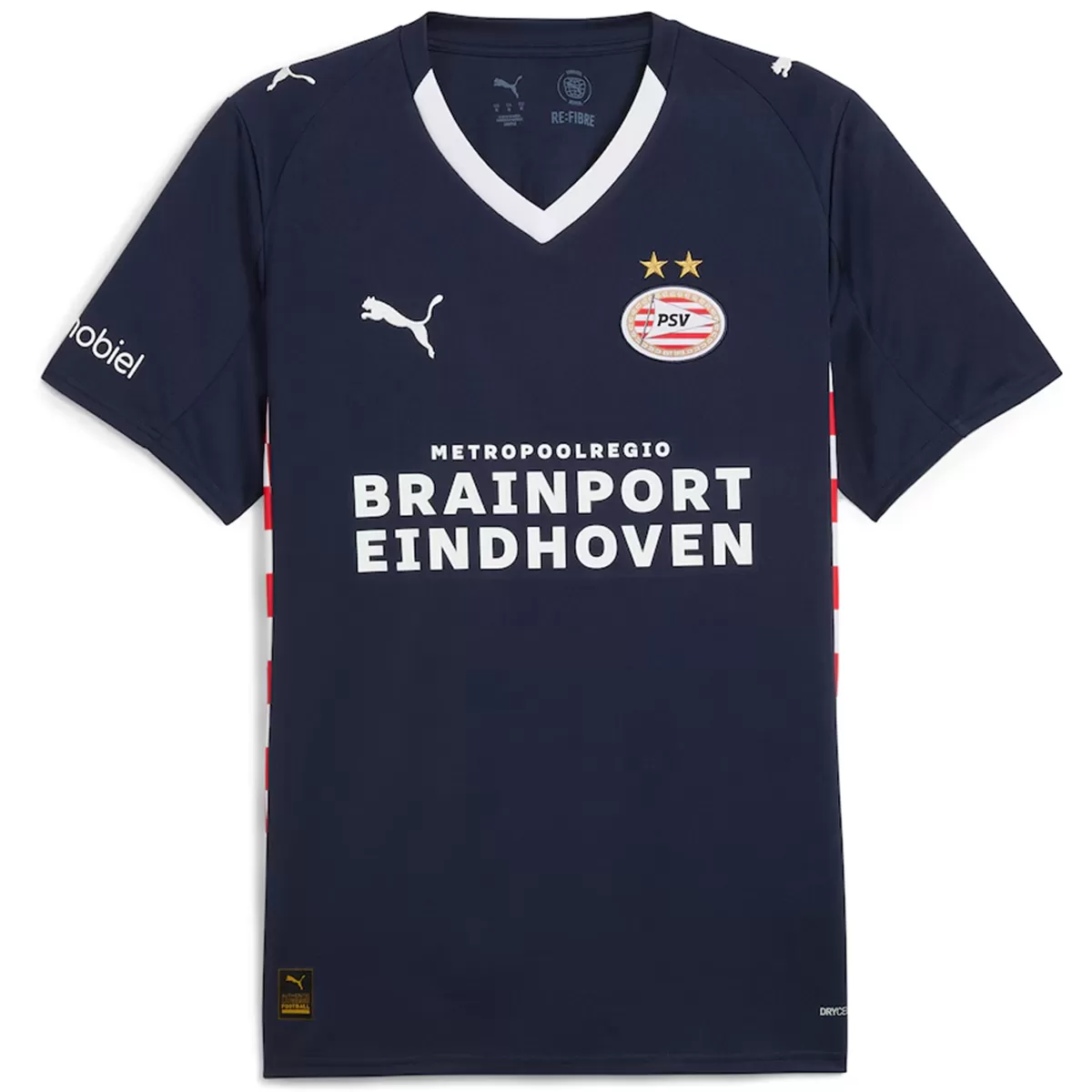 The Puma PSV 2025-2026 away shirt features a navy base, white logos, and importantly, side panels featuring the red and white squares of the Brabant flag.